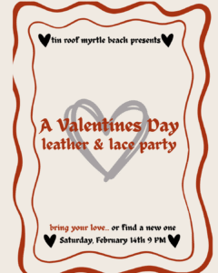 -Our Leather & Lace Party is taking over Tin Roof Myrtle Beach for a night of bold looks and electric vibes. Whether you’re rocking edgy leather, soft lace, or a mix of both, this party is all about confidence, attitude, and dancing the night away. Dress to impress, feel the energy, and let the night speak for itself.